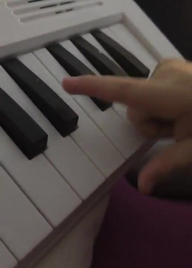 A person's hands can be seen pressing the keys of a small, white electronic keyboard. The keyboard has a pattern of white and black keys. The person uses one or two fingers to press the keys, which make a sound when pressed. The background includes parts of clothing and furniture, suggesting an indoor setting.