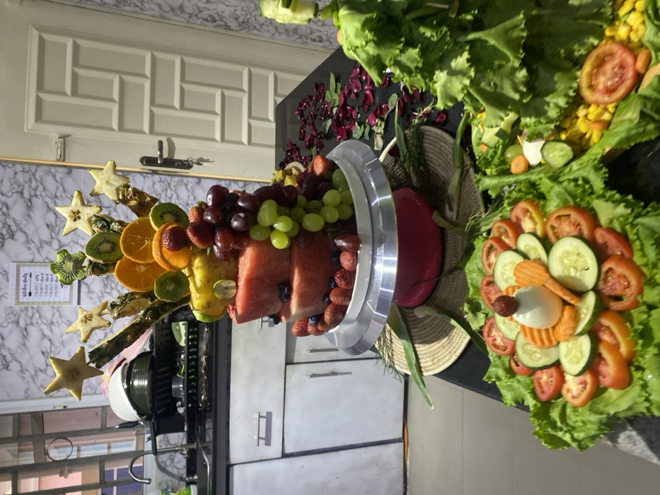 The scene depicts an elaborate display of prepared fruits and vegetables in a domestic setting within Gura Top, Nigeria