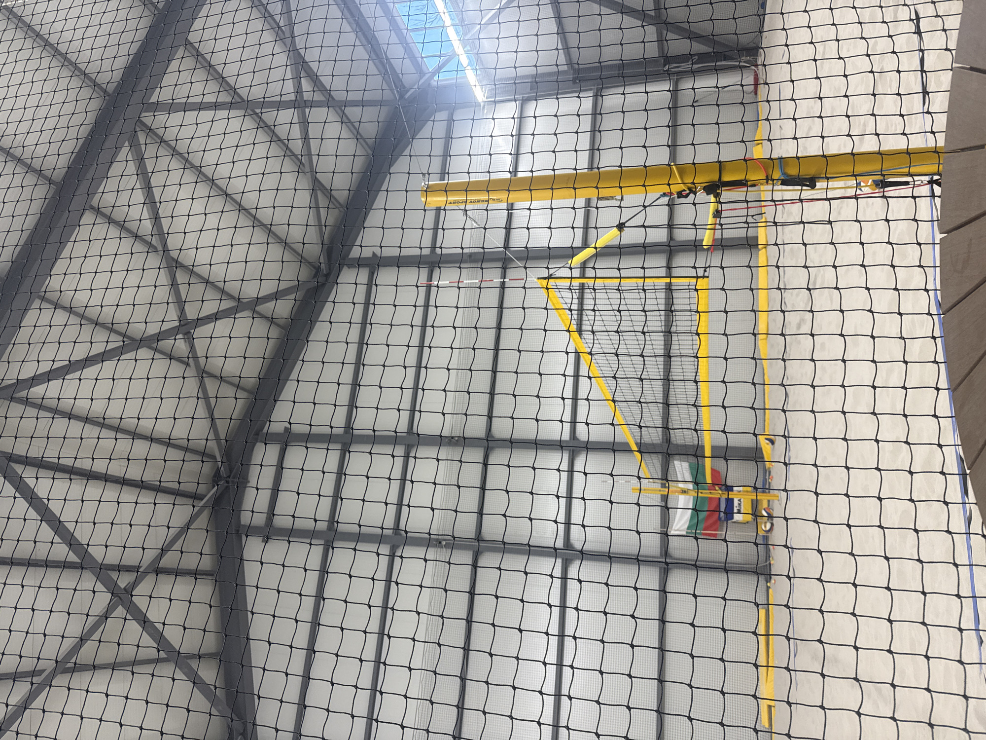 interior of a sports hall in Varna, Bulgaria. A black net is prominent in the foreground, obscuring the view. Behind the net is the hall's structure, including metal supports and a ceiling with skylights. A yellow structure resembling a volleyball net setup is visible, including the net, post, and antennae. A flag or banner in green, white, and red is attached to the net.