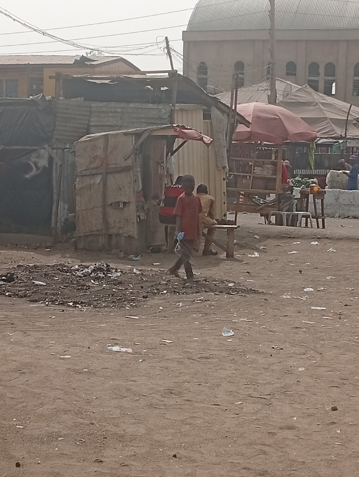 The scene depicts an outdoor market area or informal settlement in Sabon Gari West, Nigeria, under an overcast or hazy sky