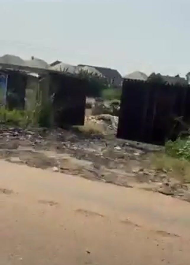The video depicts a street scene taken from the perspective of someone riding in a yellow auto rickshaw. The rickshaw moves along a dirt road, passing by overgrown vegetation, a concrete wall, buildings and utility poles. The sky is overcast.