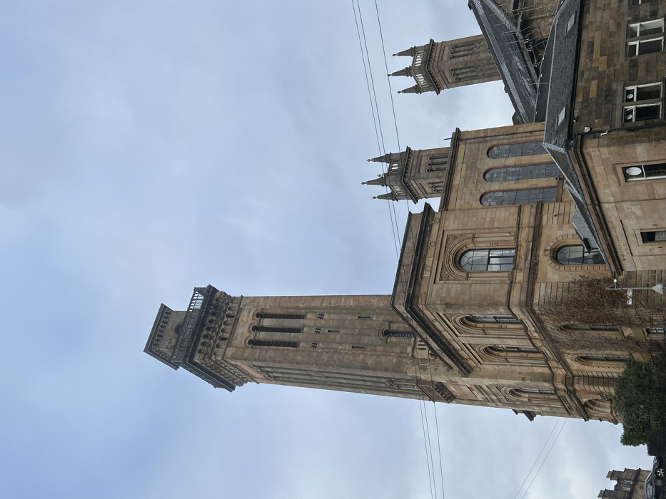 A low-angle shot captures a tall, ornate, stone building with multiple towers against a cloudy sky