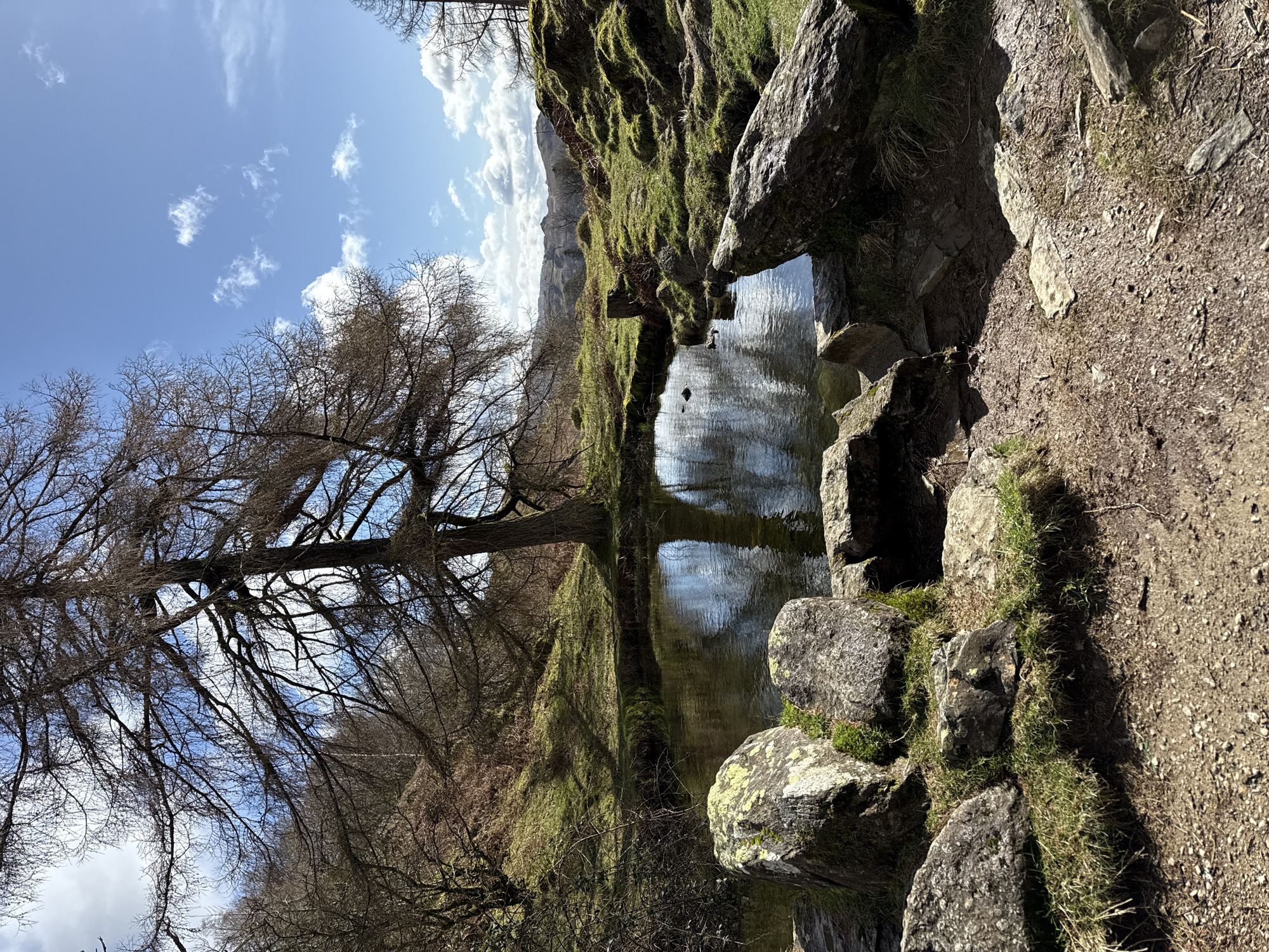 This image displays a natural landscape within Grasmere, United Kingdom, centered around a small, calm body of water. A large deciduous tree, currently bare of leaves, stands prominently on the far bank of the water, its expansive branch structure visible against a bright blue sky with scattered white cumulus clouds. The tree's silhouette and a segment of the sky are reflected on the water's surface. In the immediate foreground, a dirt path, composed of compacted earth and small stones, descends towards the water's edge. The path is bordered by several large, irregularly shaped rocks, many exhibiting green moss growth and surrounded by short green grass. The terrain beyond the water and path consists of gently undulating slopes, covered primarily with short green grass and patches of brown, likely dormant, vegetation. Bare trees and shrubs populate the hillside to the left, while distant, rounded hills are visible on the horizon to the right. The scene is devoid of human or animal subjects and is illuminated by direct sunlight, casting clear shadows.