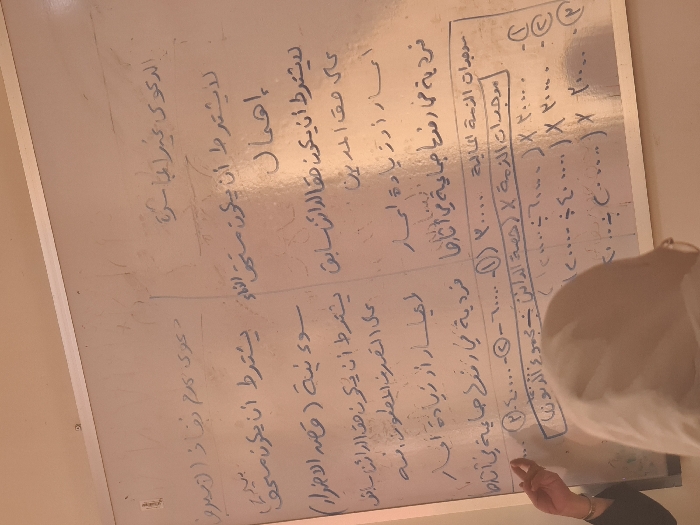 This image captures an indoor scene in Al-Kiswa, Syria, focused on a whiteboard during an instructional setting. A large, white magnetic whiteboard with a silver frame is prominently displayed, covered with handwritten Arabic text and numerical entries in blue or black marker. Visible Arabic phrases include "الدعوى غير المباشرة" (The Indirect Lawsuit), "إهمال" (Negligence), "يشترط أن يكون" (It is required that it be), and "موجبات الذمة الحالية" (Current Liabilities). A rectangular box is drawn around a section of text and numbers on the lower-middle portion of the board, which also features circled numbers (e.g., ①, ②, ③, ④) alongside numerical values. In the left foreground, the right arm and hand of an individual with light brown skin are visible, clad in a dark, long-sleeved garment. Their index finger points directly at the lower-left section of the whiteboard, specifically at the content within or near the drawn box. In the immediate foreground, partially obscuring the lower-middle of the whiteboard, is the back of a second individual's head and shoulders. This person is wearing a light-colored hijab and glasses, facing towards the whiteboard, indicating observation or engagement with the material. The scene is lit by indoor illumination, giving the image a slightly warm tone. The environment appears functional, consistent with a classroom or lecture hall.