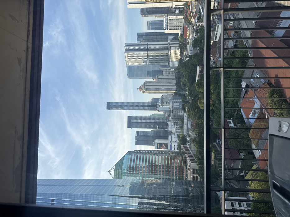 A panoramic daytime cityscape of South Jakarta, Indonesia, is presented from an elevated vantage point. A dark, horizontal balcony railing spans the lower third of the frame, with a dark, indistinct object, possibly outdoor furniture, partially visible on the balcony floor to the bottom-left. The top edge of the viewing aperture shows minor wear and discoloration. The mid-ground and background are densely populated with modern high-rise buildings and skyscrapers under a mostly clear blue sky featuring scattered white cirrus clouds. Prominent structures include a tall, slender, glass-clad skyscraper positioned on the far left. To its right, another distinctive building features a green, pyramidal roof and horizontal reddish-brown striped facades. Numerous other multi-story residential and commercial buildings with varied glass and concrete exteriors extend across the horizon. Below these towering structures, and interspersed between them, are areas of dense green foliage and lower-rise buildings characterized by their red or grey corrugated roofs. No human subjects or specific activities are discernible within the scene.