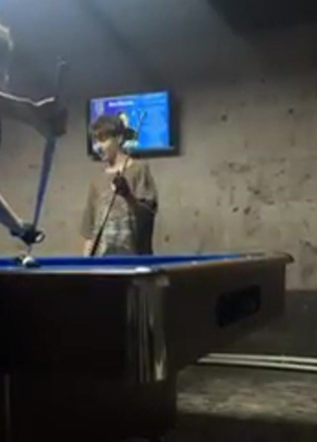Two young men are in a dimly lit pool hall playing billiards. The person in the foreground is wearing a black shirt and dark pants, assembling a pool cue. Another young man stands behind the pool table, holding a pool cue and smiling. A TV mounted on the stone wall behind them displays news coverage. A pool cue rack and a stool are visible on the right side of the frame. The pool table is brown with blue felt. A white electrical cord runs along the base of the wall.