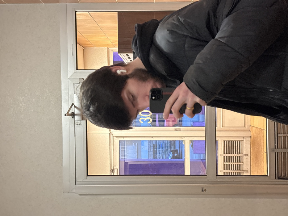 An indoor selfie captures a male subject holding a dark-colored smartphone, reflecting his upper body and face in a glass door. The subject has dark, medium-length hair and a beard, is wearing a black hooded sweatshirt under a black puffer jacket, and has white wireless earbuds in both ears. A golden ring is visible on his right ring finger. The indoor setting shows a light-colored, textured wall to the left and top, framing a white-trimmed glass door with a visible door closer arm at the top. To the right, dark brown paneling is partially visible, indicating further interior space. Reflected through the glass door is an urban street scene in Cachan, France. The left pane reflects a purplish-tinted building facade across the street and a dark-colored vehicle. The right pane prominently reflects a large, stylized golden number "30" affixed to the exterior glass of a building, likely indicating its street number. Below the "30", a reflected street-level view shows a light brown mat on the ground, a grated structure (possibly a vent or grate), and glimpses of a paved street and other building elements. The scene depicts the subject taking a self-portrait while facing outward from a building with the street number "30" visible in its reflection.