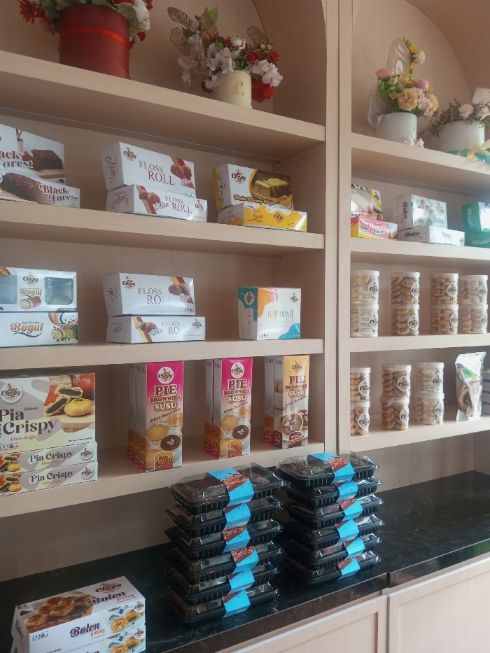 A bakery shelf displays an assortment of packaged goods. The top shelf features "Black Forest" cake, "Floss Roll," and other baked items. The middle shelf presents "Bogul" and "Floss Ro," with other pastries in boxes. The bottom shelf exhibits "Pia Crispy" and "Pie Brownies Susu." Stacks of brownies in black containers with blue labels are on the counter, alongside boxes of "Bolen" pastry. The shelves are light beige.
