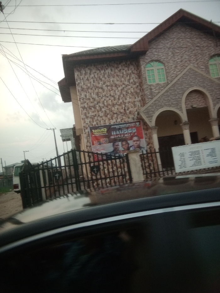 A view from inside a car shows a two-story building with a facade of layered brown and beige tiles. The building has a peaked roof and arched window openings. A sign with several headshots and red lettering is affixed to the building, partially obscured by a black metal fence. A small white bus is parked on the left. Power lines crisscross in the sky.