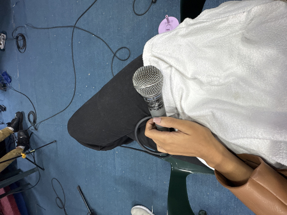 A high-angle, first-person photograph depicts an individual's lap in an indoor venue. The subject's left hand, with light brown skin and light pinkish-beige manicured fingernails, grips a worn dynamic microphone, consistent with a Shure SM58 model, by its gray body. The microphone rests on a white, textured towel covering the person's lap, which is clad in black pants. A portion of a brown leather-like sleeve is visible on the left. The person is seated on a dark green chair, partially visible on the left. The floor is covered with a light blue carpet or mat, exhibiting wear and scattered minor debris. Numerous black audio cables are extensively strewn across the carpet, connecting unseen equipment. In the upper left background, the lower legs and black-shoed feet of another person, wearing light brown pants, are visible beside a yellow-jointed tripod stand, likely a microphone stand. A small, light purple plastic object with a suction cup base is on the floor to the right. The scene indicates a setup for an event, broadcast, or recording. The specific location within Caracas, Venezuela, is not discernible from the image; however, the environment is consistent with a professional or semi-professional audio-equipped venue such as a studio, auditorium, or conference hall.