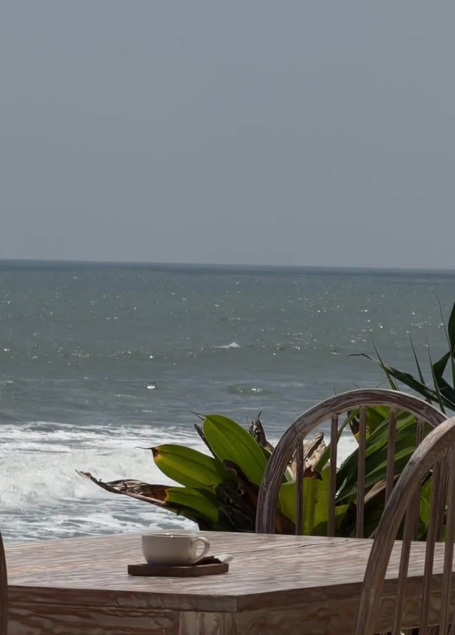 The video presents a static shot of an oceanside scene. A wooden table and two chairs are prominently featured in the foreground, with a white cup and saucer placed on the table. Green tropical plants partially obscure the chairs and the table. In the background, the ocean stretches to the horizon under a grey, overcast sky. The waves gently break near the shore, creating a visual and potentially auditory element of tranquility. There are no people visible.