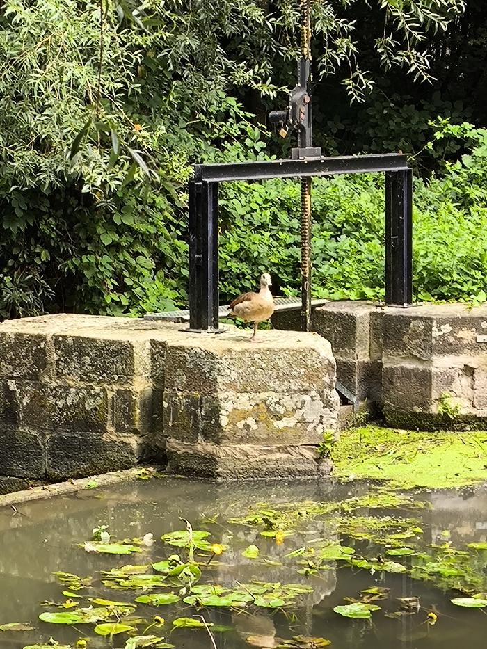 The image displays a static scene at a water control gate in Wolfisheim, France. In the midground, a single brown and white duck stands on its left leg atop a large, weathered stone masonry block. The stone block exhibits visible discoloration, lichen, and moss growth. Directly behind the duck and the stone block, a black-painted steel structure is present, forming part of a sluice or lock gate mechanism, characterized by vertical supports and a horizontal crossbeam. A vertical chain mechanism is visible, descending from the upper portion of the steel frame. The foreground consists of a body of water partially covered by numerous green lily pads and several yellow water lilies. Significant portions of the water surface, particularly to the right, are obscured by a dense layer of bright green surface vegetation, consistent with algae or duckweed. The water itself appears dark and reflective. The background is densely vegetated with various species of green deciduous trees and shrubs. No human individuals are present.