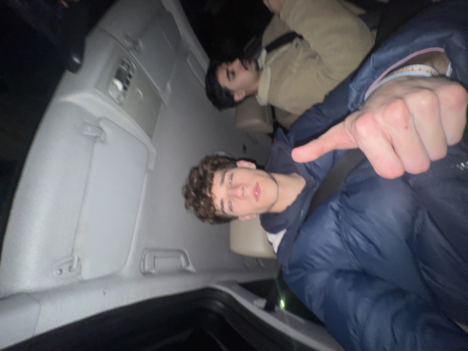 The image depicts two males inside a vehicle at night