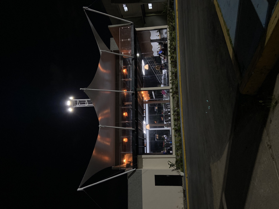 A three-story building at night features a modern design with large glass windows, displaying interior lighting and seated occupants. An intricate, illuminated white canopy structure extends outward, attached to supporting poles. The surrounding area includes a dark road, some sparse greenery, and a partially visible dark structure in the background. The overall ambiance suggests a contemporary architectural style.