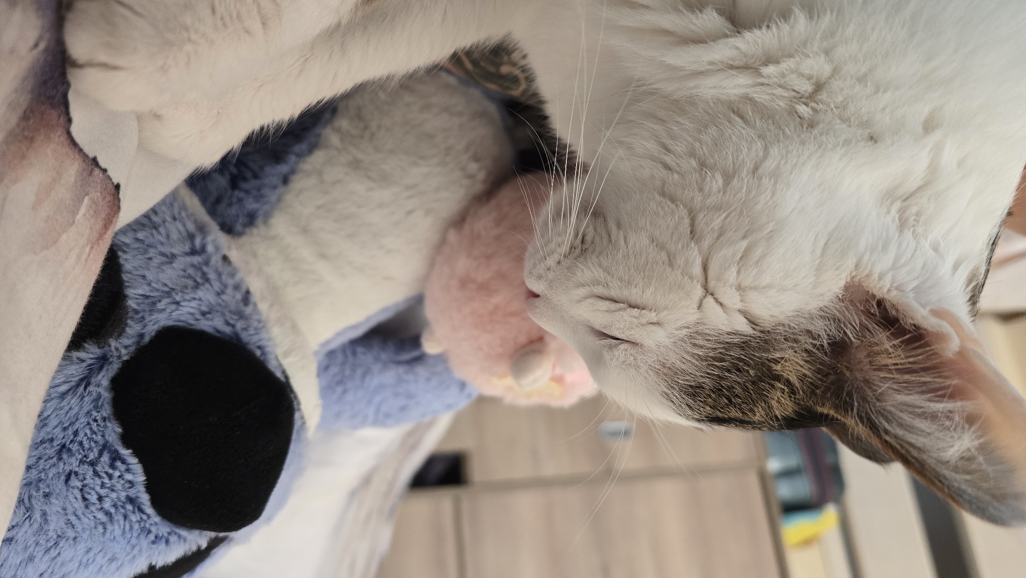 An indoor scene in Tsarevo, Bulgaria, depicts a domestic cat positioned in the left portion of the frame. The cat has white fur with distinctive brown and black tabby markings on its head and ears. Its eyes are closed, and its white nose makes contact with a small, round, pink, fluffy stuffed toy located to the right of its face. Long white whiskers extend from the cat's muzzle. Further to the right and slightly behind the pink toy, a larger, partially visible stuffed animal with blue and white fur and a prominent black facial patch is present. A white cat paw rests in the foreground. The background is blurred, showing light-colored, possibly wooden, furniture elements and other indistinct residential objects.