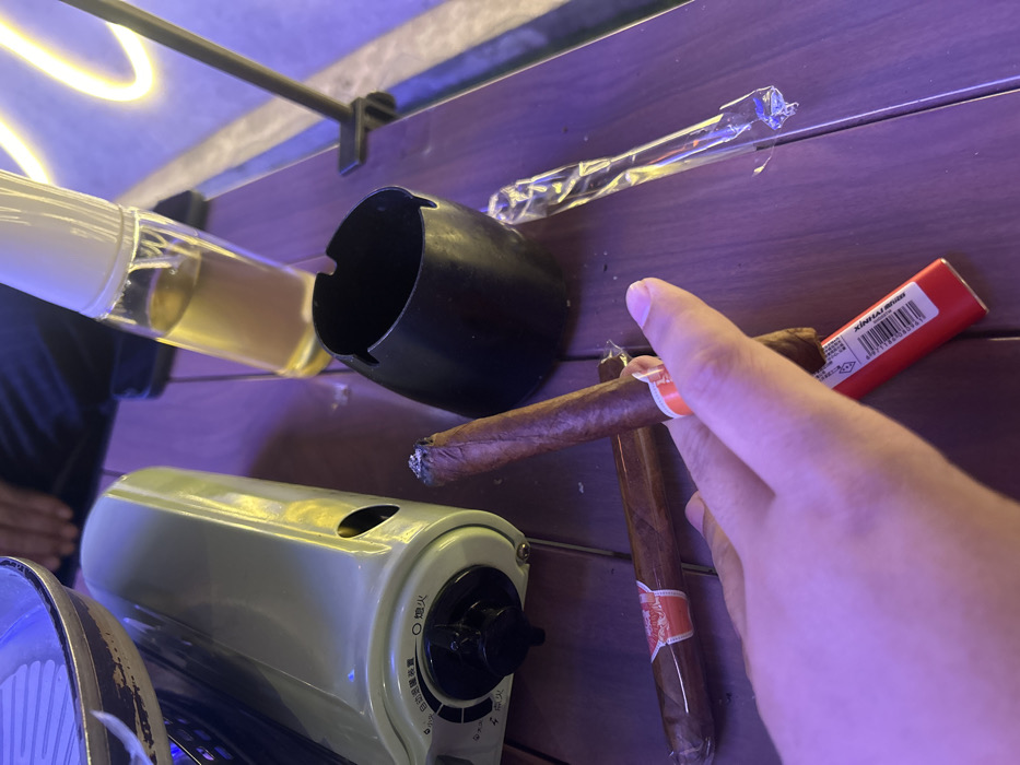 This scene, located in Yuexiu District, China, depicts a wooden tabletop illuminated by purple and yellow neon light. A human hand holds a lit, dark brown cigar with a red band, alongside a red rectangular lighter displaying Chinese characters and a barcode. Two additional dark brown cigars are present on the table; one unwrapped with a red band, the other sealed in a clear plastic wrapper with a visible red label. A black, conical ashtray rests near the lit cigar. To the left, a pale green portable gas stove with a black control knob and Chinese text is partially visible, positioned beneath a metal grill pan. A clear glass bottle with a white cap, containing a yellowish liquid, stands in the background behind the ashtray. A crumpled clear plastic wrapper lies on the table. In the upper left background, dark fabric, consistent with clothing, indicates the presence of another individual.