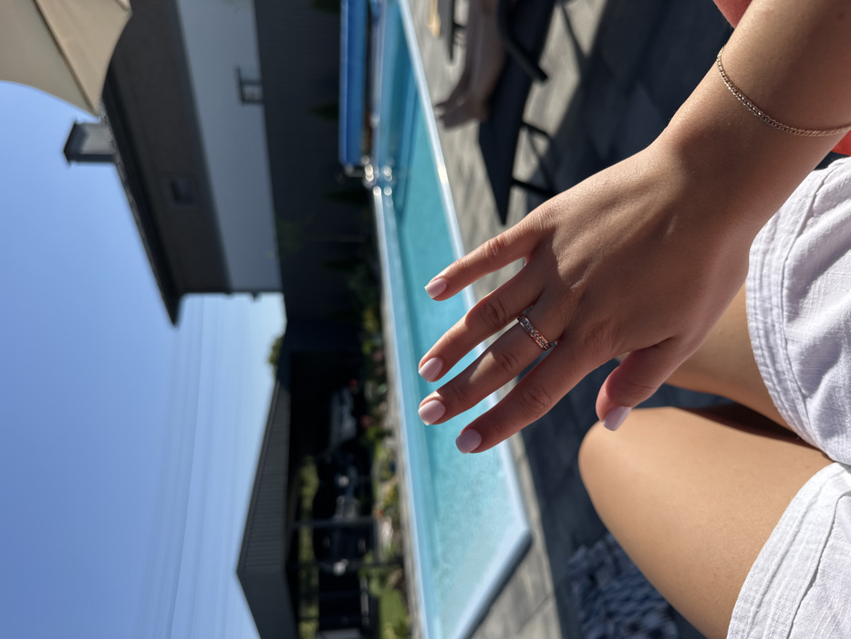 The image depicts an outdoor residential scene in Shevchenkove, Ukraine, under clear, bright daylight. In the immediate foreground, a person's right hand is prominent, featuring light pink and white ombre nail polish, a gold-colored patterned ring on the fourth finger, and a thin gold-colored chain bracelet on the wrist. Below the hand, a tanned right thigh, wearing white textured shorts, is visible. A dark, textured fabric is partially visible to the lower left. In the mid-ground, a rectangular swimming pool with light blue water and white coping is visible, surrounded by grey paver stones. At the far end of the pool, a blue roll-up cover is present. To the right of the pool, a black sun lounger holds the bare legs of a second individual, and a white patio umbrella is partially visible. The background features a modern residential structure. To the left, a dark-roofed carport contains two dark-colored vehicles. To the right, a two-story house with a dark grey roof, a chimney, and a facade composed of white upper and dark grey lower sections is visible. A dark fence or wall runs along the property line behind the pool. The sky is clear blue, intersected by a thin horizontal line in the upper left.