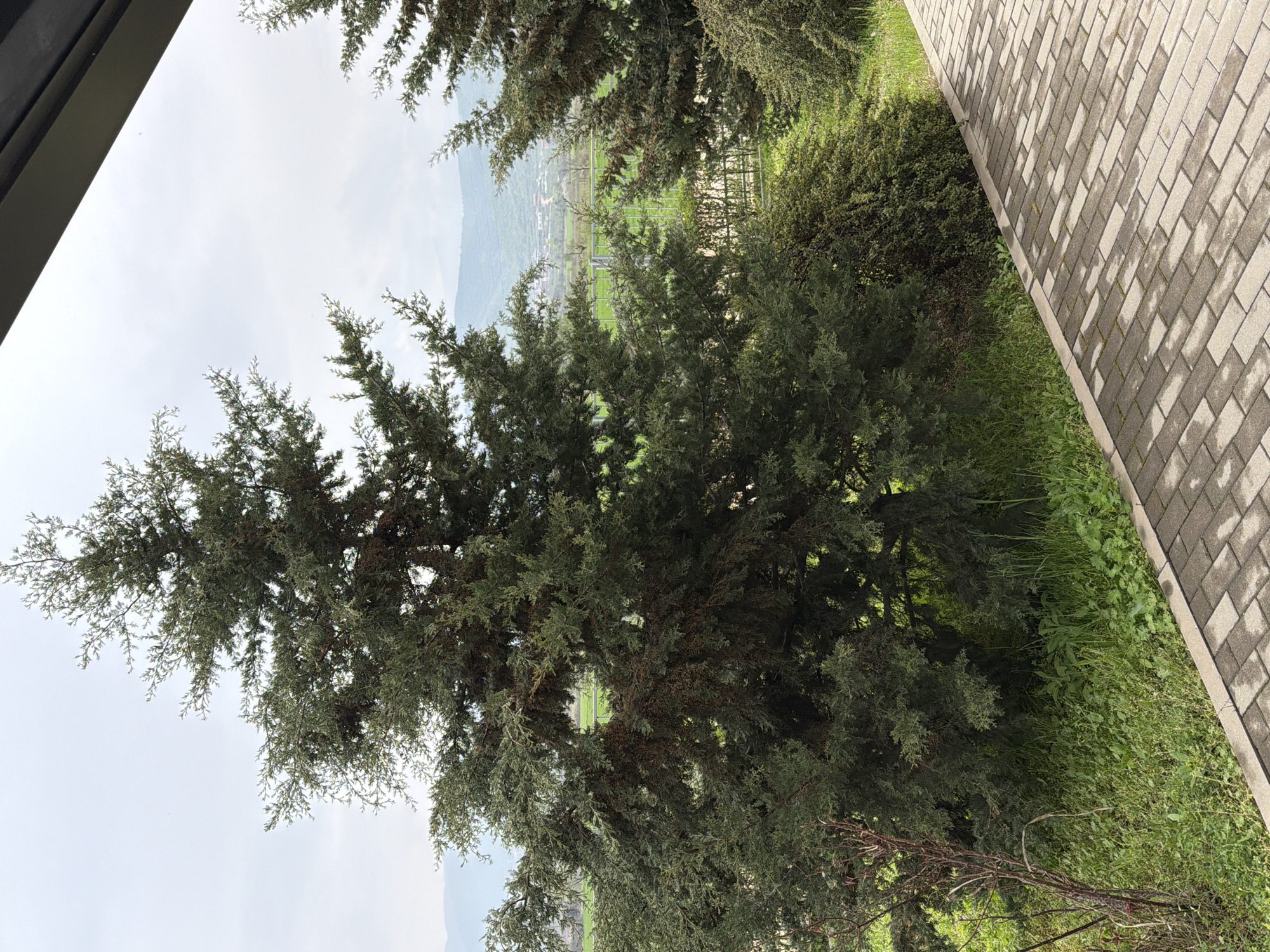 The image captures a scene in Parvenets, Bulgaria. A large evergreen tree dominates the foreground, with a backdrop of distant hills and sky visible through the branches. To the right, a brick walkway borders green vegetation. A partial view of a building structure is visible on the left. No people are visible in the frame.