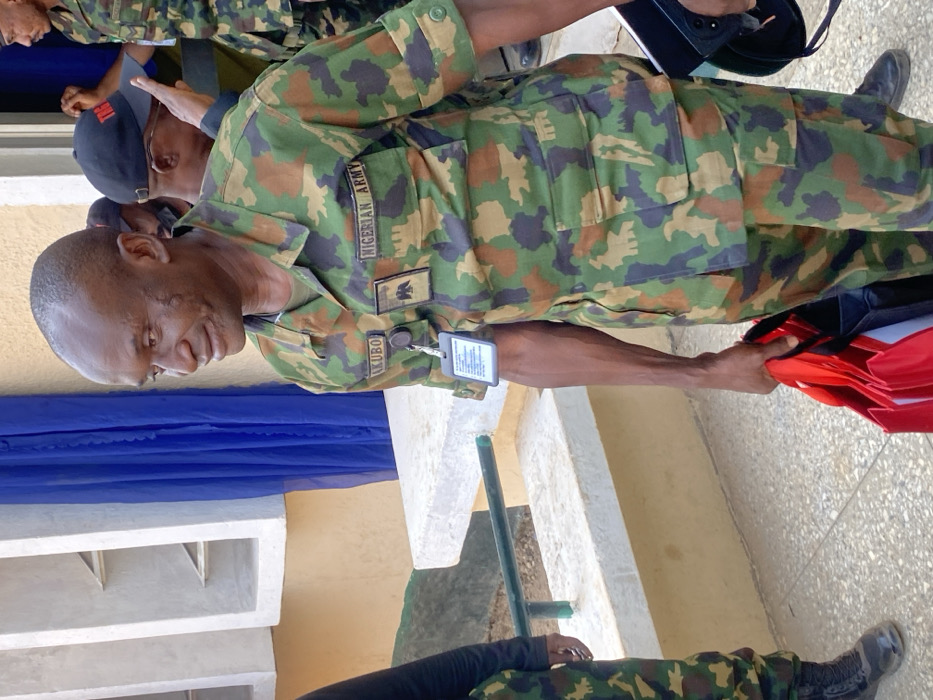 The image presents an outdoor scene in Kachia, Nigeria, featuring multiple individuals, primarily military personnel, in front of a light-colored building