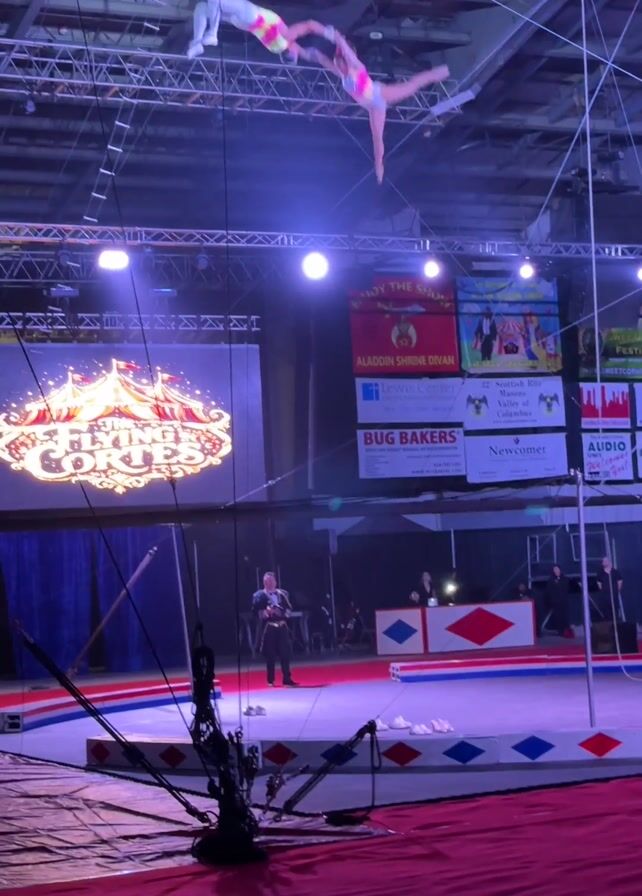 two trapeze artists performing a routine high above a circus floor. The artists, dressed in colorful outfits, swing from trapeze bars suspended from the ceiling of a large arena. The floor is covered in red and the circus ring is marked off with blue and red patterned mats. A screen behind the ring displays the words “Circus Cortes.” A man stands on the floor, apparently overseeing the performance. The environment is brightly lit with spotlights.