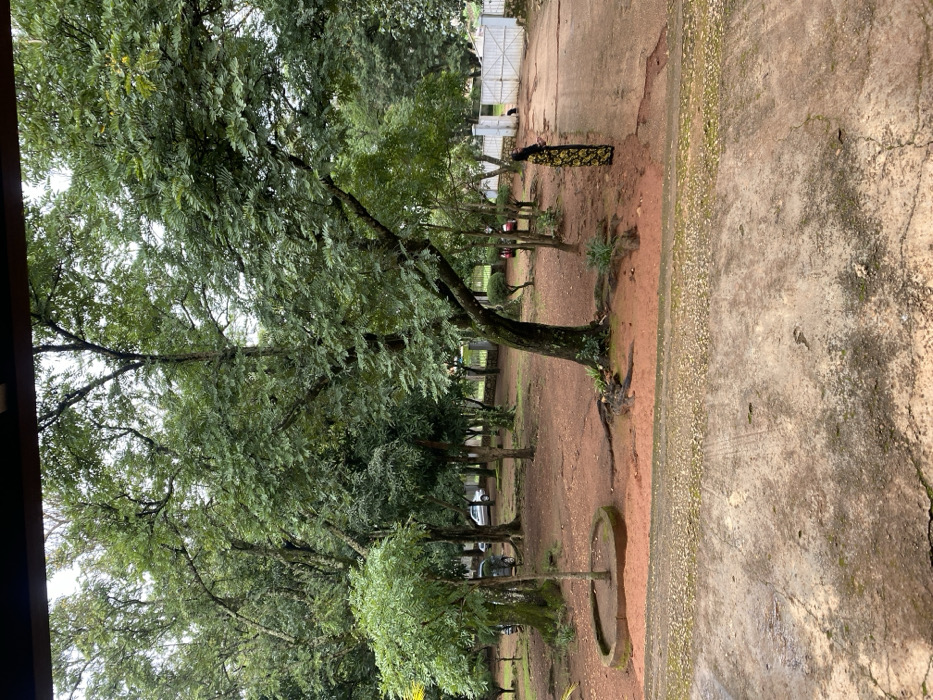 The image depicts an outdoor environment in Du, Nigeria, characterized by dense, green foliage and reddish-brown soil. In the foreground, a stained, cracked concrete surface with visible tire marks extends across the lower portion of the frame. Beyond this, a dirt ground area, rich in red earth, is populated by numerous mature trees with full green canopies. Exposed tree roots are visible on the surface. A young tree is situated within a circular concrete planter on the left side of the dirt area. Further into the scene, multiple vehicles are partially obscured by trees; a silver sedan and a dark-colored vehicle are discernible. Towards the right, a individual stands facing away from the camera, wearing a long, yellow and black patterned garment. The individual is positioned near a white metal gate, which appears partially open, flanked by white concrete pillars and a wall. A dark-colored animal, possibly a cat or small dog, is visible near the base of the gate. The sky above is overcast, providing diffuse lighting to the scene.