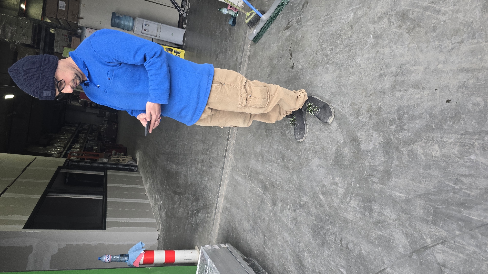 The image displays an indoor industrial or warehouse environment, likely located in Varna, Bulgaria, indicated by the visible "DEVIN" brand water bottle. In the center-right, a male subject stands, wearing a navy blue knit beanie, black-framed glasses, a royal blue long-sleeved polo shirt, tan cargo pants, and black work shoes with neon green laces. He is focused on a black smartphone held with both hands. To the left, a white and red striped bollard has a light blue cloth draped over it, supporting a clear plastic bottle of "DEVIN" water. Behind the bollard, a stack of metallic panels wrapped in clear plastic is present. The background features a partially constructed or renovated wall section with unfinished drywall and a dark-framed window. Further back, dimly lit warehouse shelving is stocked with various items. On the right side of the background, a water cooler, a yellow piece of machinery (possibly a forklift), a broom, and a dustpan are visible. The floor is dark gray concrete, showing scuff marks and minor dark stains.