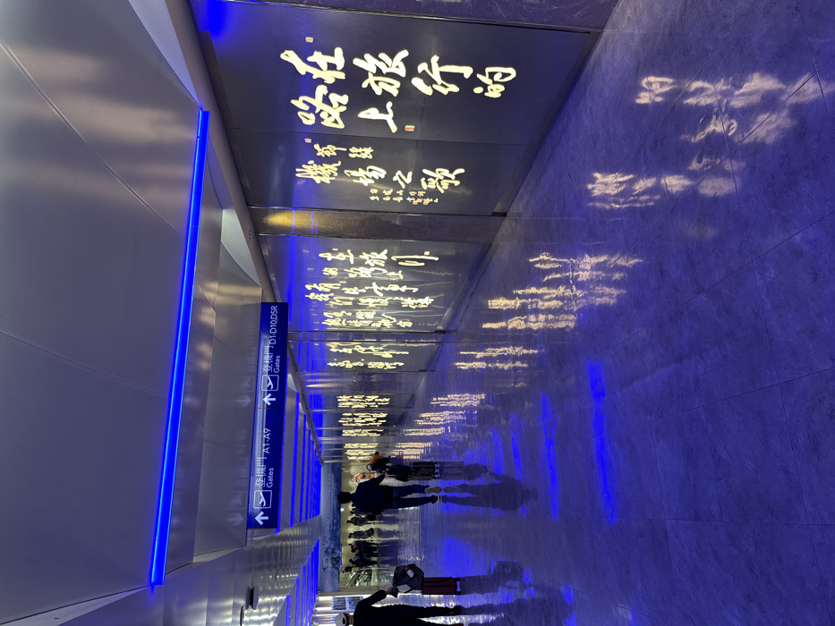n airport hallway with a modern design. Bright blue accent lights line the ceiling edges. Signs indicate directions to gates A1-A9 and D1-D10D5R. Along the wall are panels displaying Chinese calligraphy, illuminated in gold. The floor reflects the calligraphy and blue lighting, creating a blurred, modern effect. People are walking through the hallway.