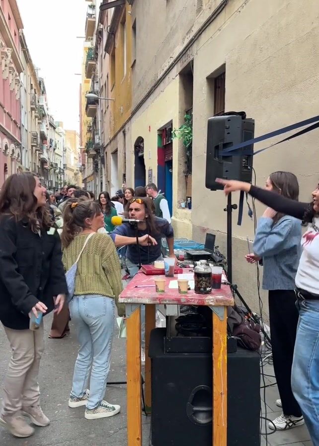 street performance in a narrow city street. A man with long hair is singing into a microphone set up on a table, in front of a speaker and a laptop. Several people are dancing and enjoying the music. Some people are holding small pieces of paper, possibly lyrics. The street is lined with tall buildings with balconies. The atmosphere is lively and festive.