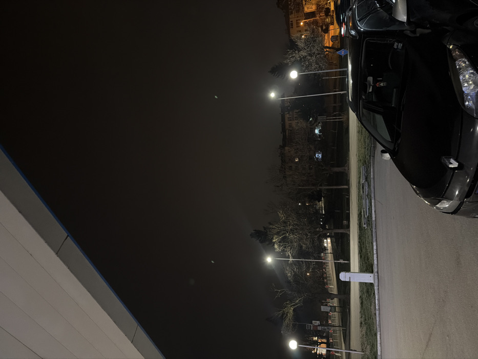 The image depicts a nighttime outdoor scene in Gorna Oryahovitsa, Bulgaria. A dark-colored, likely black, Renault Megane hatchback is parked in the foreground on an asphalt surface, with its front passenger door open. The photograph is taken from a slightly elevated perspective, looking over the vehicle's front section. In the midground, beyond the parking area, a grassy median separates the parking from a road. A white rectangular bollard or utility box is present on this median. Bare deciduous trees line the median and extend into the background. Several active streetlights illuminate the area, casting light on the trees and pavement. In the background, multiple-story buildings, consistent with residential apartment blocks, are visible, with some interior lights active. Additional trees, some appearing evergreen, are interspersed among the buildings. Faint vehicle lights suggest distant traffic activity on the road. The sky is dark, showing a minimal hazy glow consistent with urban light pollution at night. The upper left corner of the frame shows the underside of a light-colored structural overhang, possibly a canopy, with a thin blue line bordering its edge. No individuals are visible in the scene.