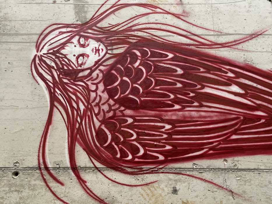 A red and white spray-painted graffiti artwork is depicted on a light gray, coarse concrete wall in Perazića Do, Montenegro. The artwork portrays a stylized, winged, humanoid figure, primarily viewed from the back, with its head turned to look over its right shoulder. The figure's face is rendered in white with solid white, unseeing eyes, a small nose, and a thin mouth line; two small, dark dots are located on the forehead. Long, flowing red hair extends from the head, fanning outwards. The figure possesses prominent, layered wings, executed in shades of red with white outlines, which extend down its back. The concrete wall substrate features visible vertical seam lines and a circular formwork hole in the upper left section. No other individuals or dynamic actions are present in the scene.
