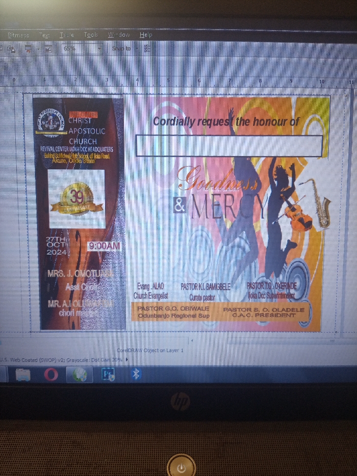 The image displays a photograph of an HP laptop screen showing the CorelDRAW application interface. The screen exhibits vertical scan lines and pixelation. Visible on the screen is a digital invitation design for the "CHRIST APOSTOLIC CHURCH, REVIVAL CENTER UOKA DCE HEADQUARTERS," located at "Saking St. Micheal Primary School off Itele Road, Akure, Ondo State." The invitation is for a "39th ANNIVERSARY" event scheduled for "27TH OCT 2024" at "9:00 AM." The design features a two-panel layout. The left panel, with a dark brown background, includes the church logo, a gold "39 ANNIVERSARY" emblem, and lists "MRS. J. OMOTULALA" as Assistant Choir and "MR. A.I. OLESEUN" as Choir Master. The right panel, with an abstract orange, yellow, and blue background, states "Cordially request the honour of" with a blank space, prominently displays "Goodness & Mercy," and shows dark silhouettes of three individuals: one with raised arms, one dancing, and one playing a violin with a saxophone adjacent. This panel also lists multiple church officials: "Evang. ALAO" (Church Evangelist), "PASTOR K.I. BAMIGBELE" (Curate Pastor), "PASTOR T.O. OYERINDE" (Joka Dcc Superintendent), "PASTOR G.O. OBIWALE" (Odubanjo Regional Sup), and "PASTOR S. O. OLADELE" (C.A.C. PRESIDENT). The CorelDRAW interface shows a menu bar with options such as "Bitmaps," "Text," "Tools," and "Help," a zoom level of "65%," and rulers along the top and left edges of the workspace. The laptop's taskbar is partially visible at the bottom of the screen, displaying icons for applications including Opera, Photoshop, and Bluetooth. Below the screen, the laptop's physical surface, possibly a textured fabric or desk mat, and a circular power button are visible.