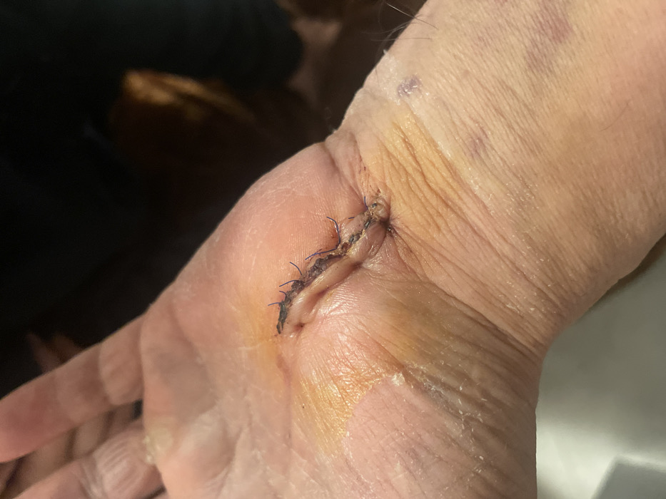 A close-up image shows a human hand with a sutured wound on the wrist