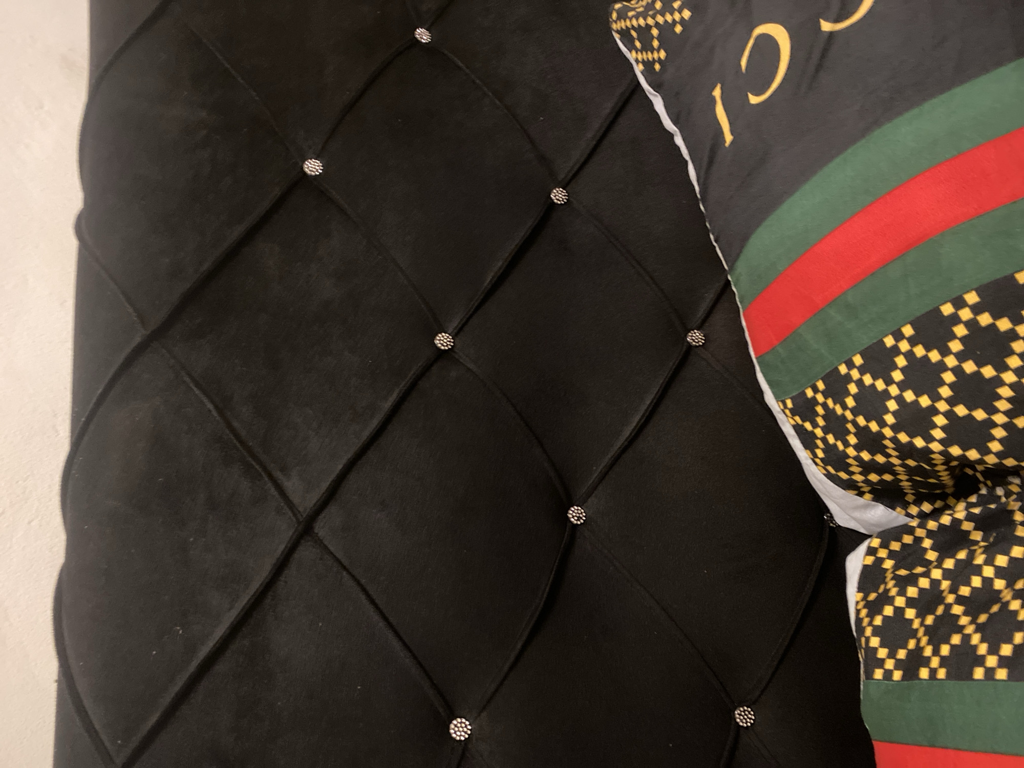 - "A close-up shot reveals a black, tufted headboard with diamond-shaped indentations, each adorned with a decorative button" by FM-4Jqiz1, licensed under CC BY 4.0