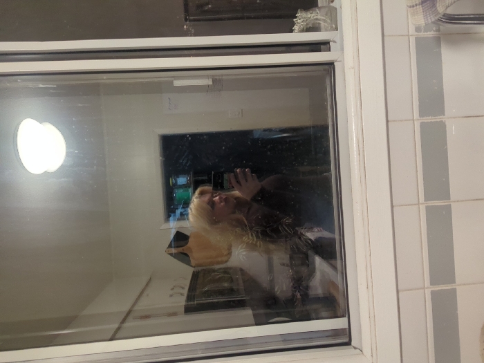 A selfie reflection of a subject, presumed female, with long, voluminous, light-blonde hair, is visible in a glass panel or window, situated in Area D (Elaho/Garibaldi), Canada. The subject wears a dark-colored top and holds a dark smartphone, partially obscuring the lower face, indicating the action of taking the photograph. The reflected interior displays a room with a white ceiling and a single circular flush-mount light fixture. To the reflection's left, a dark framed item and a light-toned, possibly wooden, paddle-shaped object are mounted on a wall. Behind the subject's reflection, a dark doorway reveals a glimpse of another space containing shelves with multiple green-tinted jars or bottles. The glass surface exhibits visible streaks and particulate matter. The foreground, below the white window frame, consists of a tiled wall. This wall features white rectangular tiles with horizontal bands of light grey tiles. A small section of a light-colored, patterned textile is discernible at the bottom right of the frame.