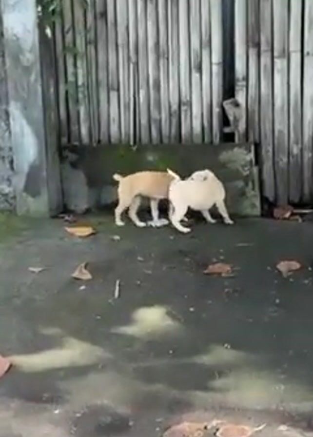 Two small puppies, one tan and one white, are playing near a weathered bamboo fence and a concrete wall. The puppies are wrestling and nipping at each other in a playful manner. The ground is concrete, partly covered with moss and scattered dry leaves. The lighting is bright and the video appears to be taken during the daytime.