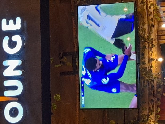A TV screen shows a soccer game between Chelsea and Barcelona, with Chelsea leading 2-0