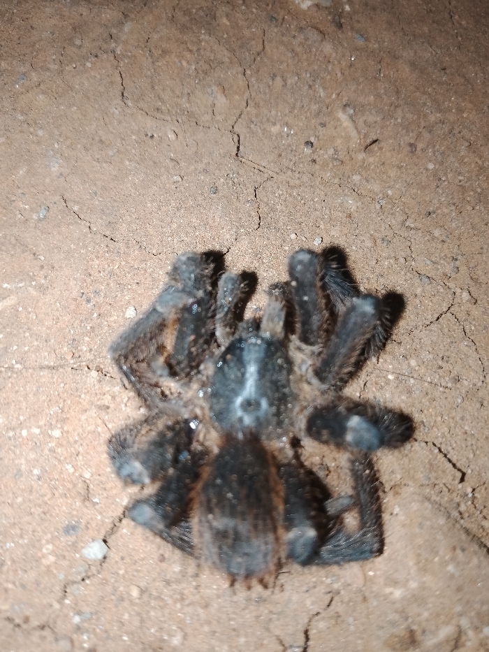 A blurry close-up shows a tarantula lying on a cracked, dry surface