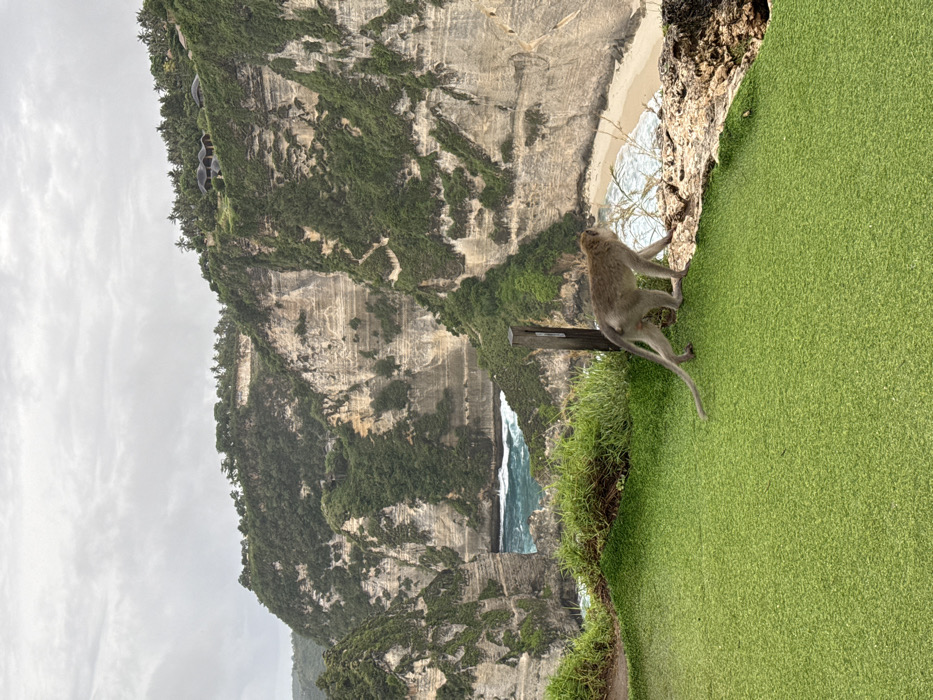 The image displays a panoramic coastal scene in Pejukutan, Indonesia, under an overcast sky. In the foreground, a single light brown/grey macaque monkey with a long tail is observed walking from left to right, positioned on the edge where bright green artificial turf meets natural rock and sparse vegetation at a cliff's precipice. A dark brown wooden post is vertically fixed behind the monkey, extending above the turf level. The background features towering, stratified limestone cliffs, extensively covered with green vegetation and trees, including distant palm trees. A deep cove or bay is visible between the cliffs, containing turbulent turquoise-blue ocean water with white breaking waves and a crescent-shaped sandy beach at its base. On a distant clifftop to the right, several dark-roofed structures, likely accommodation units, are discernible amidst the greenery. No human subjects are present.