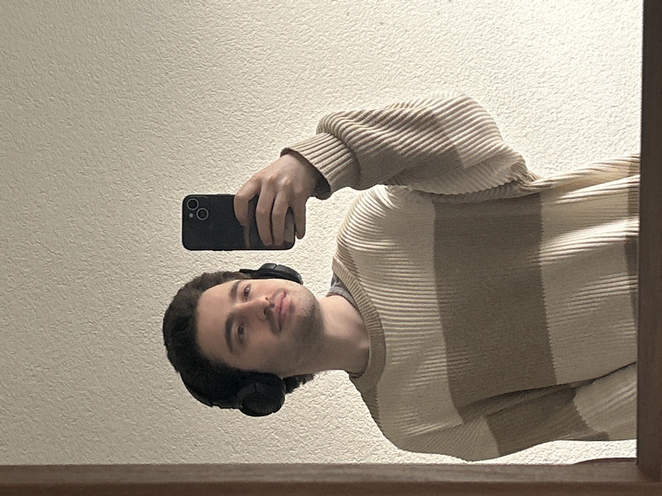 An indoor scene within the city of Hagen, Germany, depicts a young adult male reflected in a mirror. He possesses dark, wavy hair and light facial stubble. He is wearing black over-ear headphones and a ribbed knit sweater with horizontal stripes alternating between beige and light brown/taupe, layered over a grey crew-neck t-shirt. The man is holding a dark-colored smartphone with a dual-lens camera system in his right hand, oriented as if capturing his own reflection. His gaze is directed to the right of the frame, accompanied by a subtle smile. The background consists of a light-colored, textured wall. A dark wooden or plastic mirror frame is visible along the bottom and left edges of the reflection. The specific location within Hagen, Germany, is not discernible from the visual information presented.