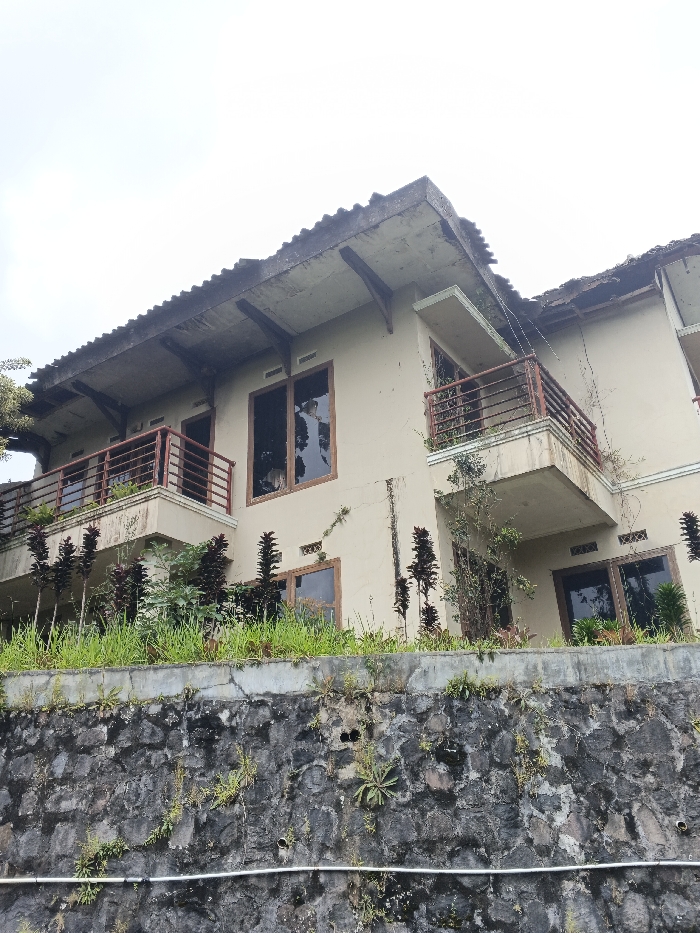 An old, weathered two-story building stands atop a stone wall. The building, painted in a light shade, features multiple windows with dark frames. Balconies with red railings extend from the upper level. Overgrown greenery sprouts from the wall and in front of the building, partially obscuring the facade. The sky is overcast, contributing to the building's neglected appearance.