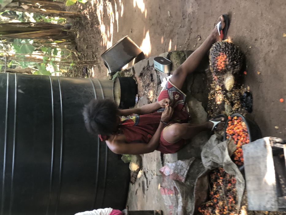 An individual with dark skin and dark, curly hair sits on a concrete ledge in an outdoor setting in Orifite, Nigeria. They are clad in a red and patterned wrap-around garment and wear white and black flip-flops on the left foot, and orange and white flip-flops on the right foot. Their hands are occupied with processing small, roundish, orange-red palm fruits or kernels. On the ground in front of the individual, a black basin contains a quantity of these processed orange-red fruits. Adjacent to this, a grey sack partially covers another pile of the same fruits. To the right, a large, spiky, dark brown palm fruit bunch lies on the dirt ground, still bearing many of the orange-red fruits. A black plastic bag is positioned near the palm fruit bunch. A small, light-colored wooden stool is visible in the lower left foreground. Behind the seated individual, a large, dark-colored cylindrical plastic water tank stands on a raised foundation. To the right of the water tank, a black metal pot rests on the ground. Further right, a silver-colored metal container is tilted on its side. A small, silver electronic device is also visible on the concrete ledge near the individual's right leg. The ground is unpaved dirt, scattered with small rocks and debris. Dense green foliage and tree trunks are visible in the background.