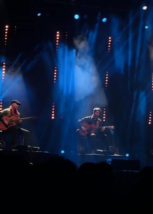 Two men are performing on stage. They sit on stools and play acoustic guitars. The stage is bathed in blue light with white spotlights shining on them. Behind them are vertical strings of orange lights. There is a crowd in front of the stage, visible only as dark silhouettes. A guitar rests in a stand on the stage. Smoke or fog adds to the atmosphere.