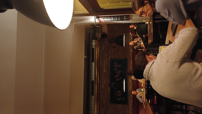 The image captures an indoor scene within a casual dining or bar establishment in Vienna, Austria, illuminated by dim, warm artificial light. In the foreground, the back of a male subject wearing a grey fleece pullover is visible, seated at a wooden table with a black keyboard-like device and other items. To his right, a female subject with dark hair and glasses is seated, wearing a light blue garment, looking towards the right side of the frame. In the mid-ground, multiple individuals are seated at wooden tables and dark booths against a brick wall. This includes a female with glasses and a male opposite her on the left, a bearded male looking left in the center, and two additional males conversing on the right. Drinks and small food items are present on several tables. The background wall features exposed reddish-brown brickwork. Above this, metallic ductwork and pipes are visible. A dark rectangular sign or artwork with lighter circular patterns is mounted on the brick wall. Two black pendant lamps hang over the background tables. A tall, narrow black menu board with white text is affixed to a wall segment on the far right, adjacent to a wooden door or window frame. A prominent dark grey pendant lamp with a brightly illuminated interior is suspended in the upper right foreground, partially out of frame. The ceiling is a plain, light-colored surface.