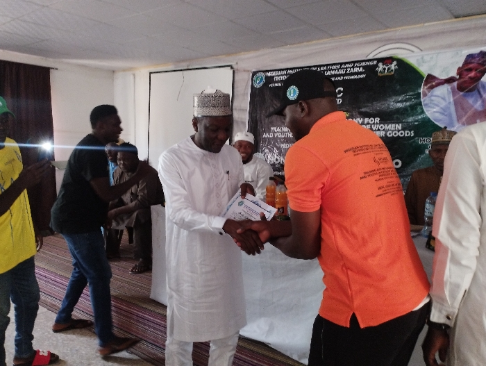 group of men gathered in a room with a tiled floor. The men are all wearing traditional African clothing. The man on the left is wearing a yellow shirt and green hat, the man in the center is wearing a white robe and a white cap, the man on the right is wearing a black shirt and blue jeans. The man in the center is handing a certificate to the man on the right. They are both smiling and shaking hands. The man on the right is holding a bottle of water. Behind the men, there is a banner that says "Nigerian Institute of Leather and Shoe Science, Technology." There is a banner behind the man on the right that says "Opportunity for Women in Leather Goods." The image was taken in Gombe, Nigeria. The coordinates are (latitude: 10.294, longitude: 11.123). The environment is a light-colored room with a large white banner on the wall. The event is likely a certificate presentation.