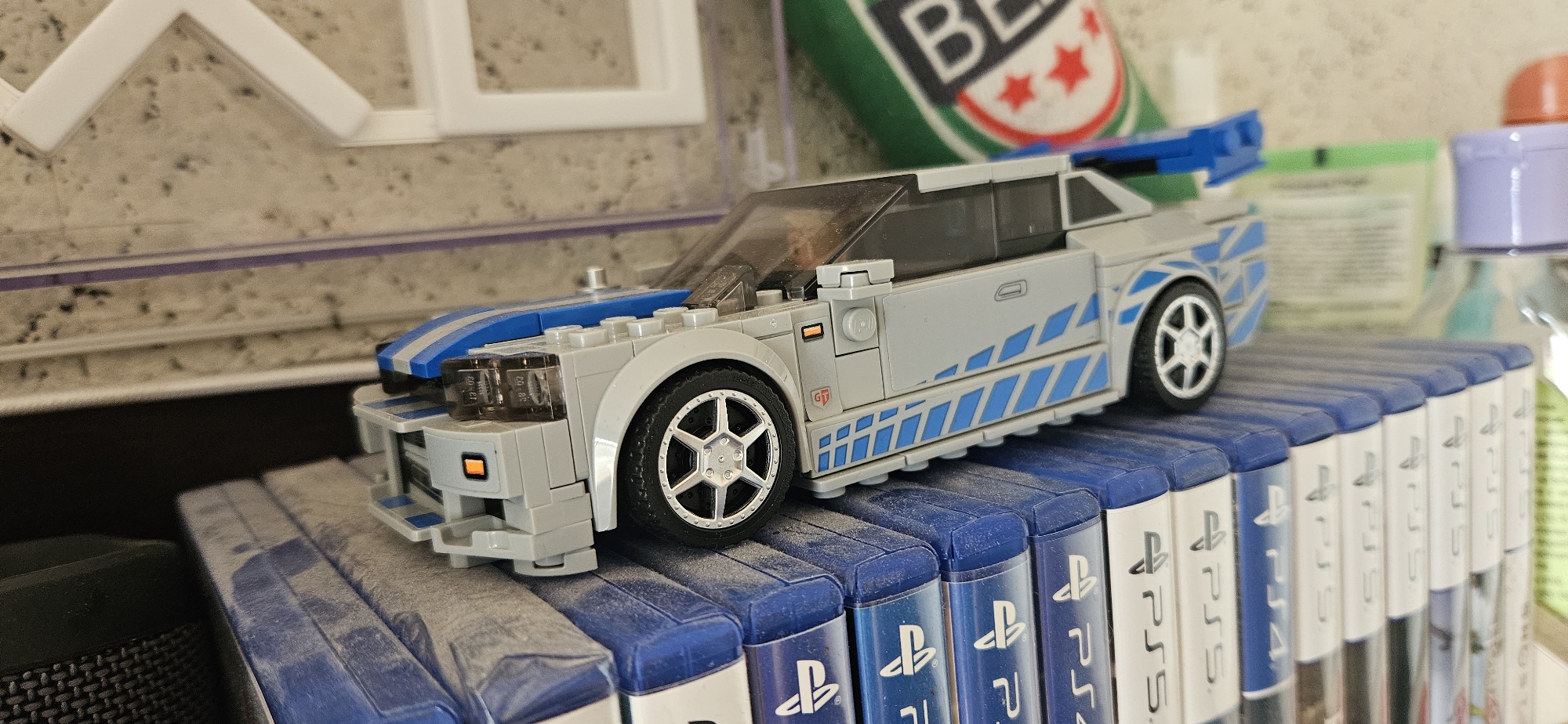 A Lego model of a car, specifically a Nissan Skyline GT-R from the Fast & Furious franchise, sits atop a stack of blue-cased PlayStation 5 game boxes. The car is light grey with blue racing stripes. The background is cluttered with various objects, including a green and white container with red stars, a clear bottle with a blue lid, and a white decorative item. The items are dusty. There is no indication that this scene is in Sofia, Bulgaria.