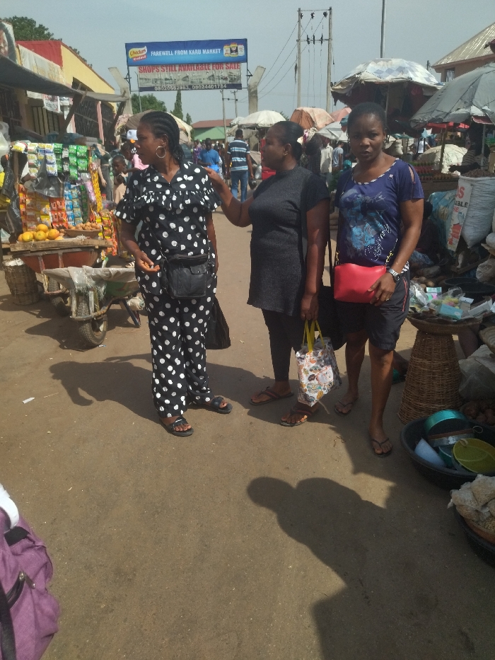 The image depicts three women standing on a dirt road in front of a market in New Karu, Nigeria