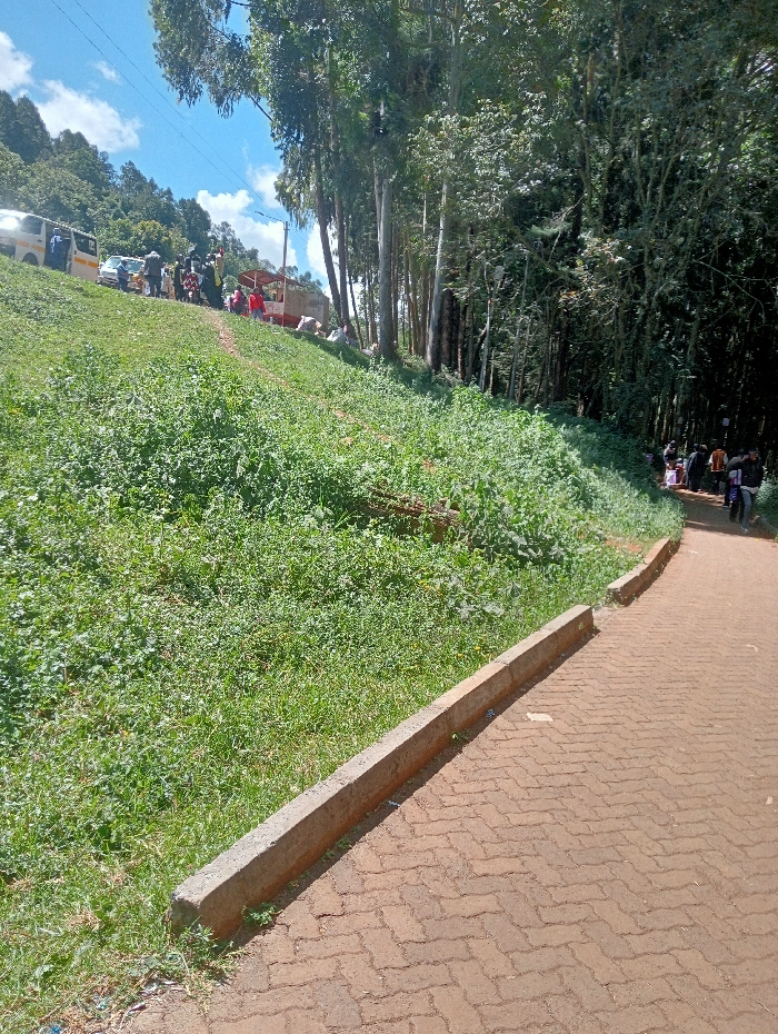 The scene depicts an outdoor environment in Waseges ward, Kenya, under a clear blue sky with scattered white clouds. In the foreground, a reddish-brown paved pathway, constructed of interlocking bricks in a herringbone pattern, extends from the lower right towards the middle distance. A concrete curb separates this path from a steep, green grassy slope covered with dense vegetation to the left. A dirt path runs diagonally up this slope. In the midground, on the upper portion of the grassy slope, a crowd of approximately 15-20 individuals is gathered near several vehicles, including at least two white vans/minibuses (one with a yellow stripe) and a light-colored truck with a covered bed. A utility pole with power lines is also visible in this area. To the right of the paved path, a dense stand of tall, slender trees forms a forested area. Another group of approximately 5-8 individuals is visible on a dirt path beneath these trees, walking away from the camera into the forested area. No specific interactions between individuals are clearly discernible.