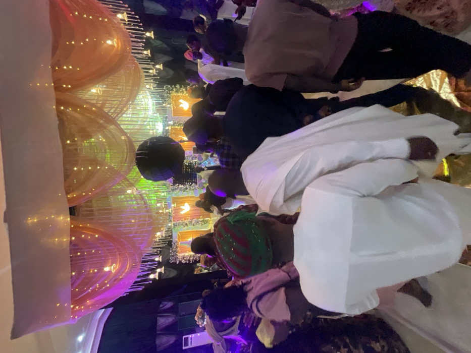 An indoor event displays a group of people, some in traditional white attire, gathered with a few wearing hats