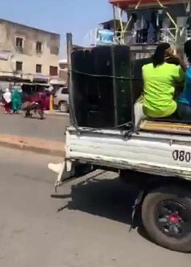 white truck with people and speakers in the back driving down a city street. The truck is followed by other cars. People are standing on a balcony above a shop, waving. Pedestrians walk along the sidewalk. The sky is clear.