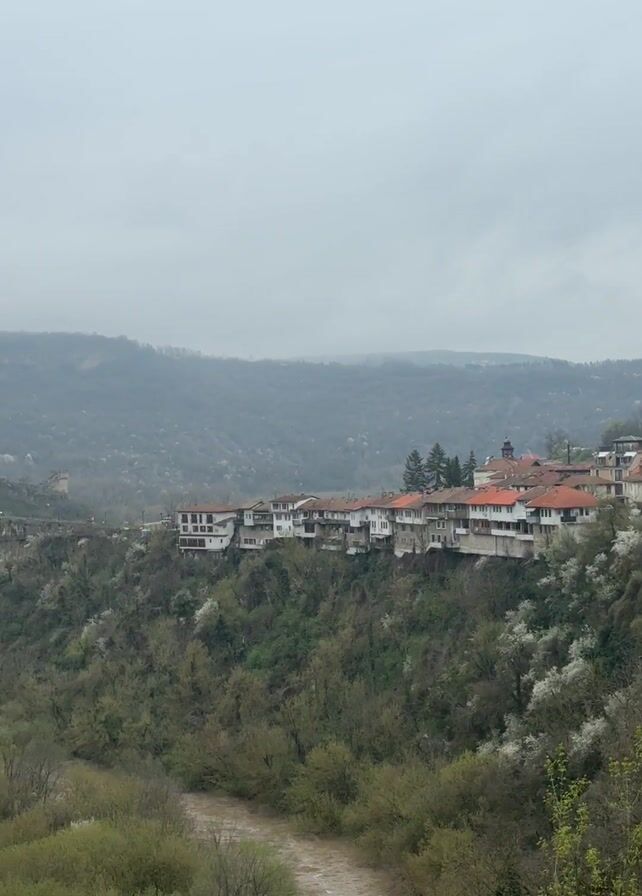 scenic view of a town nestled on a hillside, under a cloudy, overcast sky. The camera pans across the landscape, revealing houses with red-tiled roofs and white walls perched along the edge of the hill. Below the town, a river flows, its water appearing muddy and brown. In the distance, hills and mountains fade into the misty background. As the camera continues to pan, an ancient fortress comes into view. It features stone walls, towers, and a church with a steeple, all situated on a green hilltop. Trees surround the fortress and dot the landscape, interspersed with meadows. Overall, the video captures a serene and historic scene, emphasizing the town's unique location and the surrounding natural beauty.